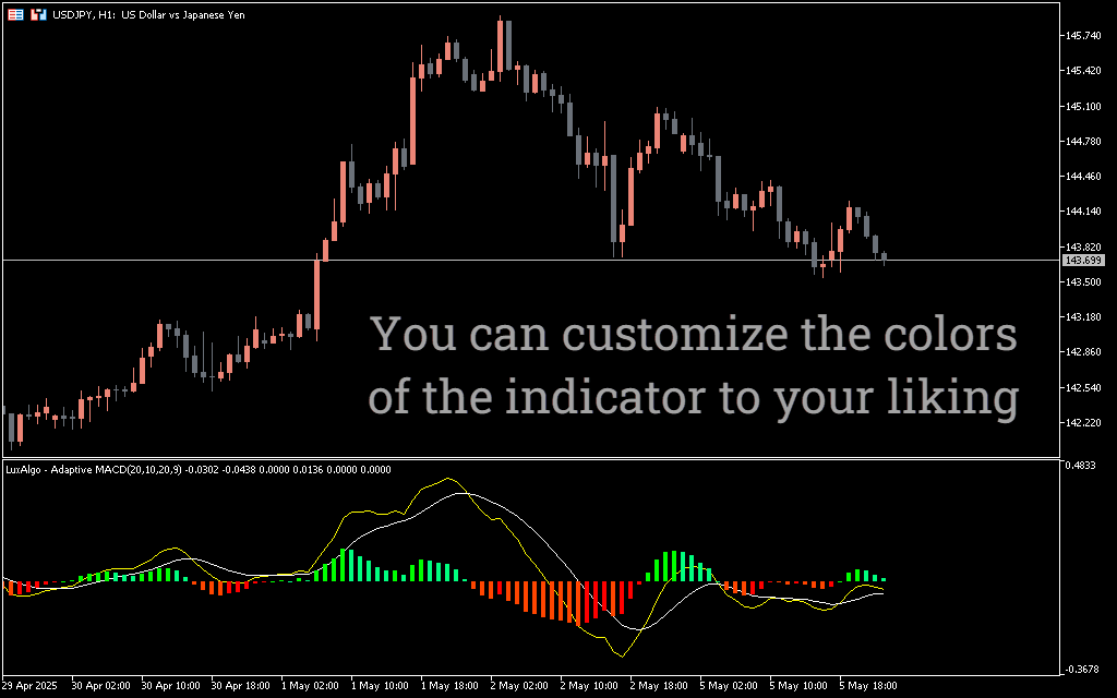 Because the adaptive logic adjusts to volatility, signals during periods of high activity become smoother and less prone to noise, helping to reduce false entries common in standard MACD setups.
