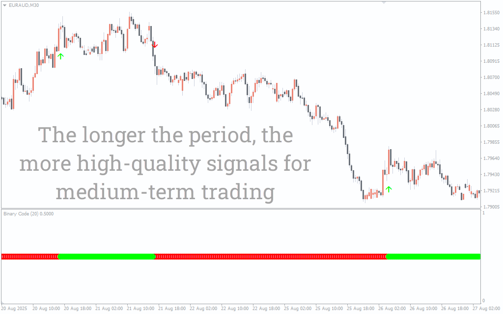 The Binary Code Indicator for MetaTrader 4 is designed to help traders identify potential trend reversals and momentum shifts with ease. It uses a binary-style logic to display bullish and bearish market signals through visual arrows on the chart and a secondary color-coded bar that helps confirm trend direction. This dual-display system makes it suitable for traders who rely on visual cues and fast decision-making—especially in intraday or short-term strategies.