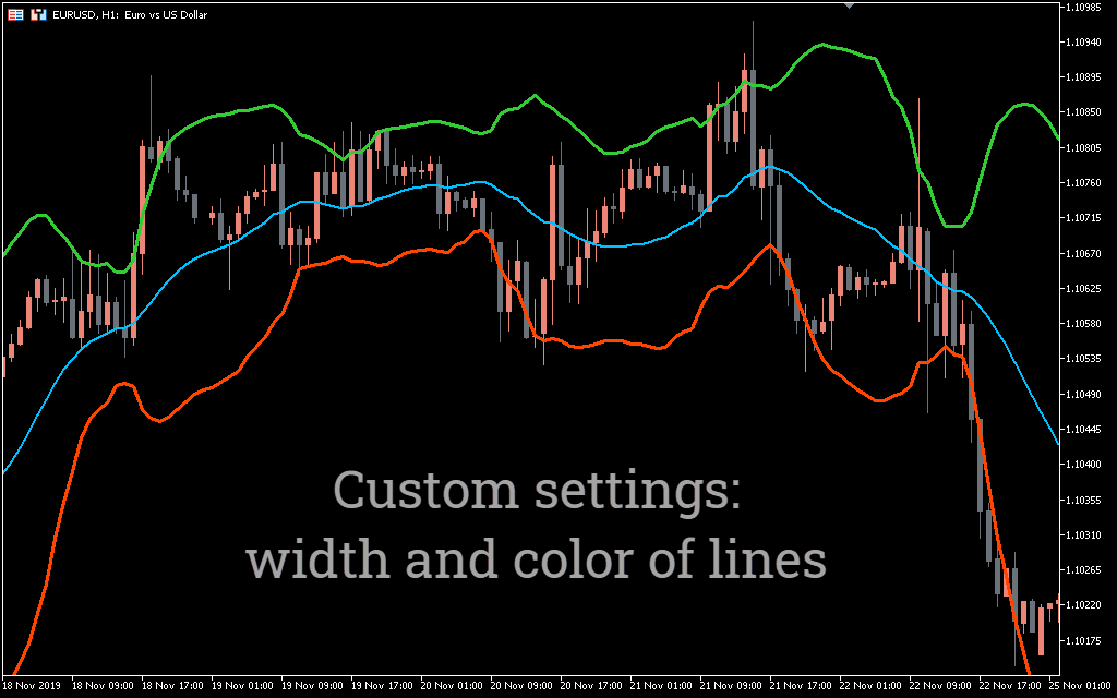 The above EURUSD H1 price chart shows the MT5 Bollinger Bands indicator in action. The indicator draws outer bands in Tomato and Midline in Dodger Blue. The middle line is the moving average and the outer bands are the standard deviation of the middle line. Forex traders can use Bollinger Bands and trade with a variety of methods.