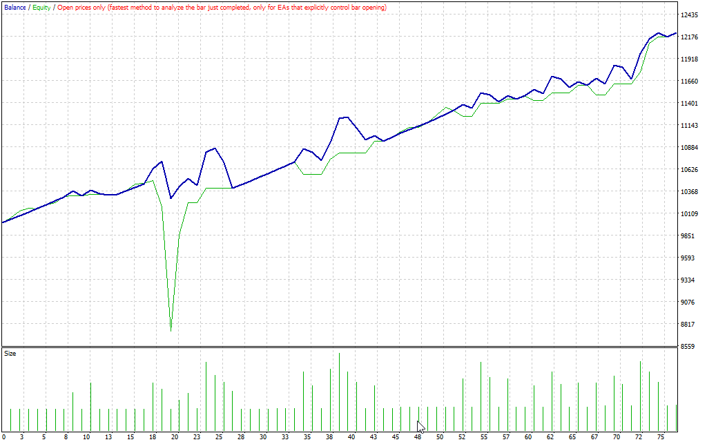 Once the market retraces, the positions are all closed together in profit. This results in the characteristic step-like growth pattern seen in the backtest outcome.