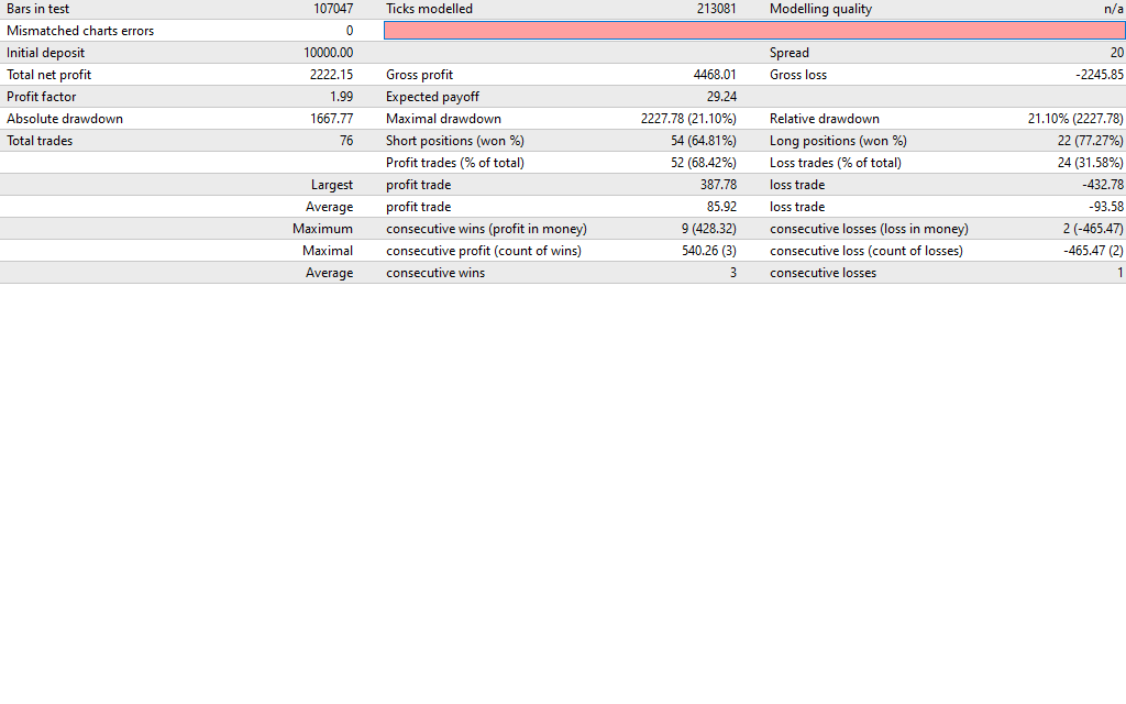 In the testing, I discovered that the EA displayed a profit of more than $2,200 with a drawdown of about 21% which is fairly common for this form of strategy. The profit factor close to 2.0 suggests that the system has a reasonable competitive advantage in normal operating conditions.