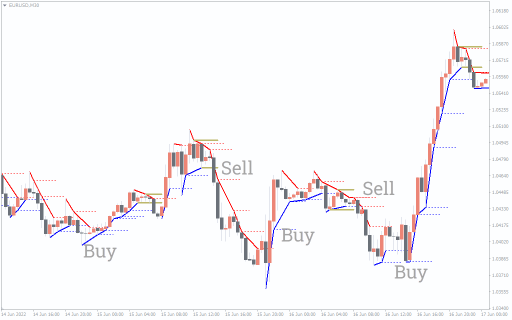 Similarly, in a bearish trend, the indicator plots a red line. So, forex traders should place a sell trade and enter the market with a stop loss above the previous swing high. A word of caution, forex traders should avoid entering the market if the indicator plots a neutral trend line. It is also better to exit any open positions at the sight of a neutral trend line as a precaution.