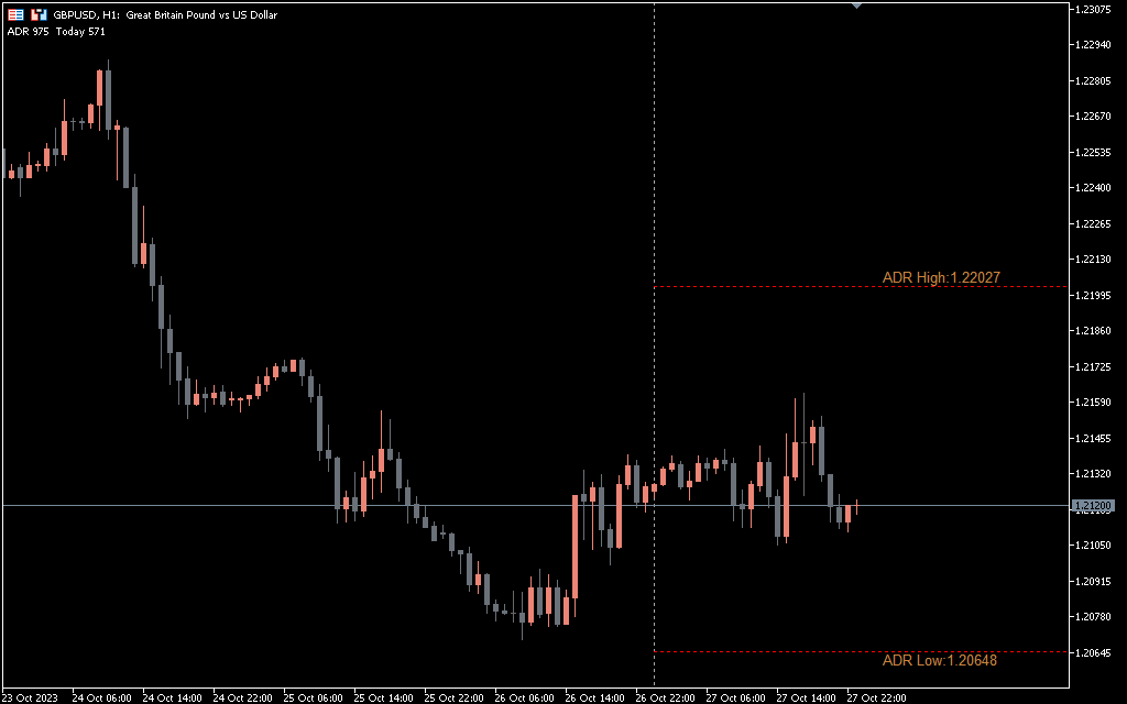 From the chart above, the ADR High level (1.22027) is the current upper ATR level. Furthermore, the ADR Low level (1.20648) is the current lower daily ATR level. The prices between these two levels shows the trading range of forex assets per day.