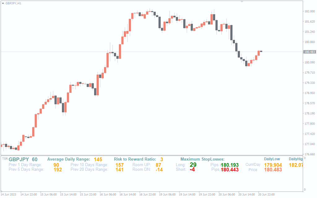 Additionally, the indicator automatically calculates the stop loss for both buy and sells positions with a risk reward ratio as set in the input settings. Though traders can place the indicator on any chart time frame time it pulls the average daily range. The indicator provides the intraday forex trader with a visual understanding of the current market in terms of the current price. And also the potential price movement for a given trading day.