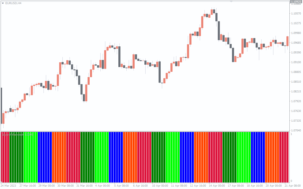 The above image shows how the indicator would look on your MT4 chart after installation. The indicator comes with five distinct colors that represent each day of the week. Furthermore, it would automatically display the trading day of the week when a mouse is pointed at any of the colors. This makes it easy to identify any trading days during a back-test.