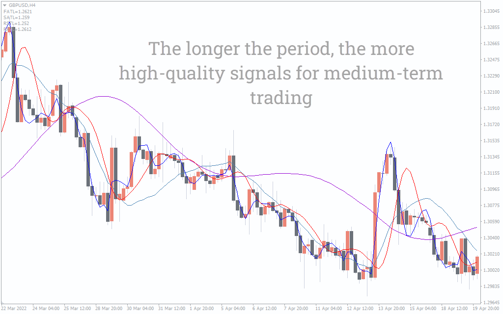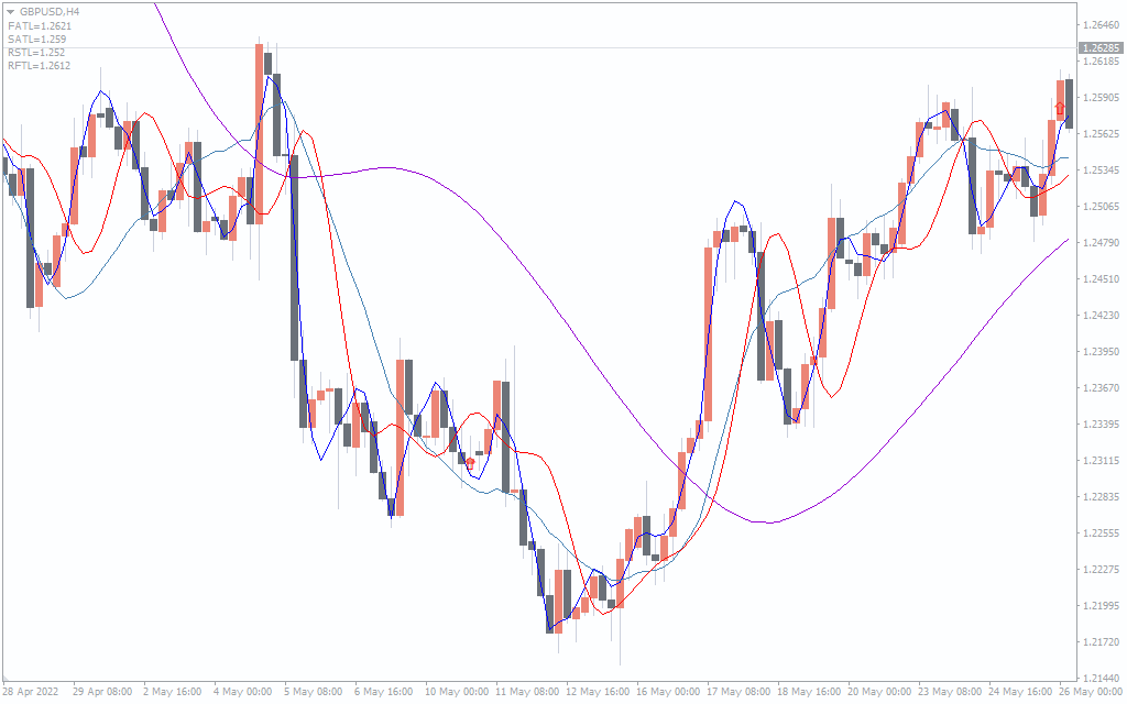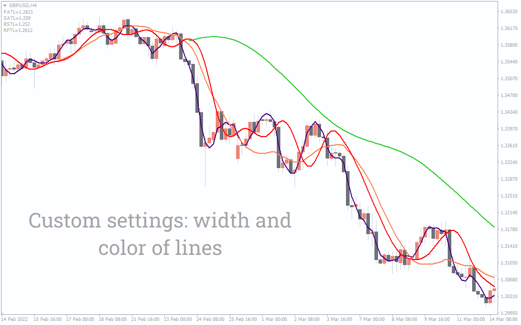 As mentioned earlier, all four lines have different colors. The blue FATL is the first line in the hierarchy. It marks the closest level to the current price. Whenever the price goes towards the FATL level, it mentions the buying point. The steel blue SATL comes next. According to the indicator, we can expect a further downside move when the price falls toward the SATL level. Here traders should go short.
