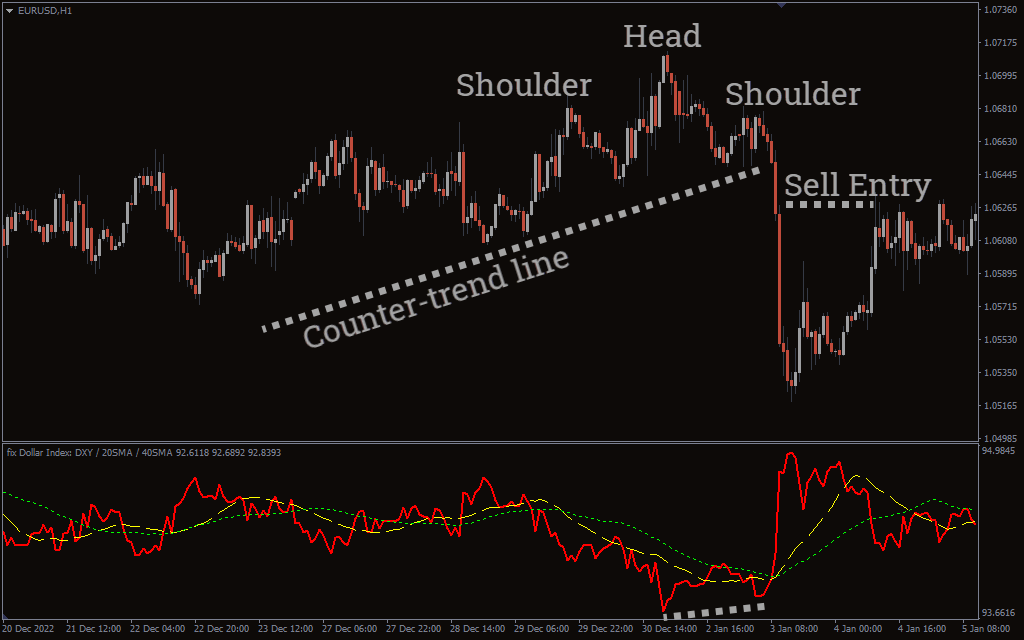 The image shows that the price created a head and shoulder pattern, which indicates a potential bearish reversal. Furthermore, the price broke out of the counter-trend line, which further suggests a strong indication of a possible bearish move. Finally, the DXY indicator shows an imminent rise in the strength of the dollar index and also crossed over the moving averages to the upside, which further suggests that the relative strength of the U.S. dollar is about to rise.