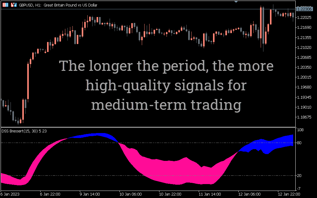 DSS Bressert is the best MT5 momentum indicator for day/intraday traders in Forex and stocks. It will help you align your trade entries with the exact direction of the trend. In addition, DSS Bressert is considered by professional traders to be a super indicator for trend following strategies. They consider this indicator a useful tool to test the signals of their existing MT5 trend indicators.