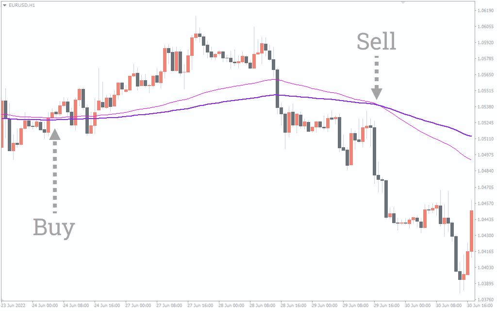 The above EUR/USD H1 chart shows the BUY and SELL signals for the indicator. To determine BUY and SELL signals, traders should look for the crossovers. Traders can take long positions when the shorter MA goes above the longer one. Conversely, when the long MA goes above the shorter one, it’s a sell signal.