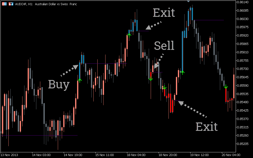 The indicator’s arrows signal the potential beginning of a new trend, which also doubles as buy/sell signals. Conversely, the horizontal bars signal the potential end of the trend.