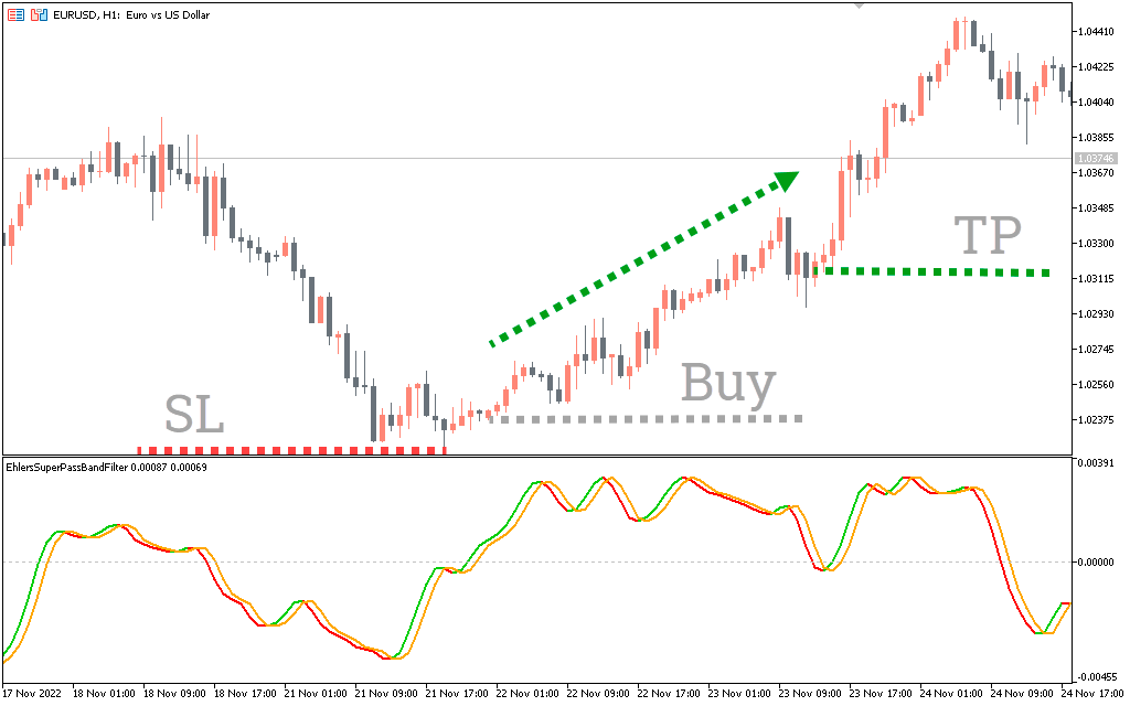 A signal line above zero means that the Ehlers Cyber Cycle value is positive, indicating a bull market. As shown in the example above, the signal line is moving above 0 while the price is showing a bullish pin bar, which is perfect for going long. Consider buying-exiting whenever the value of the cycle becomes negative. We recommend holding existing positions until both oscillator lines move in parallel in the direction you want.