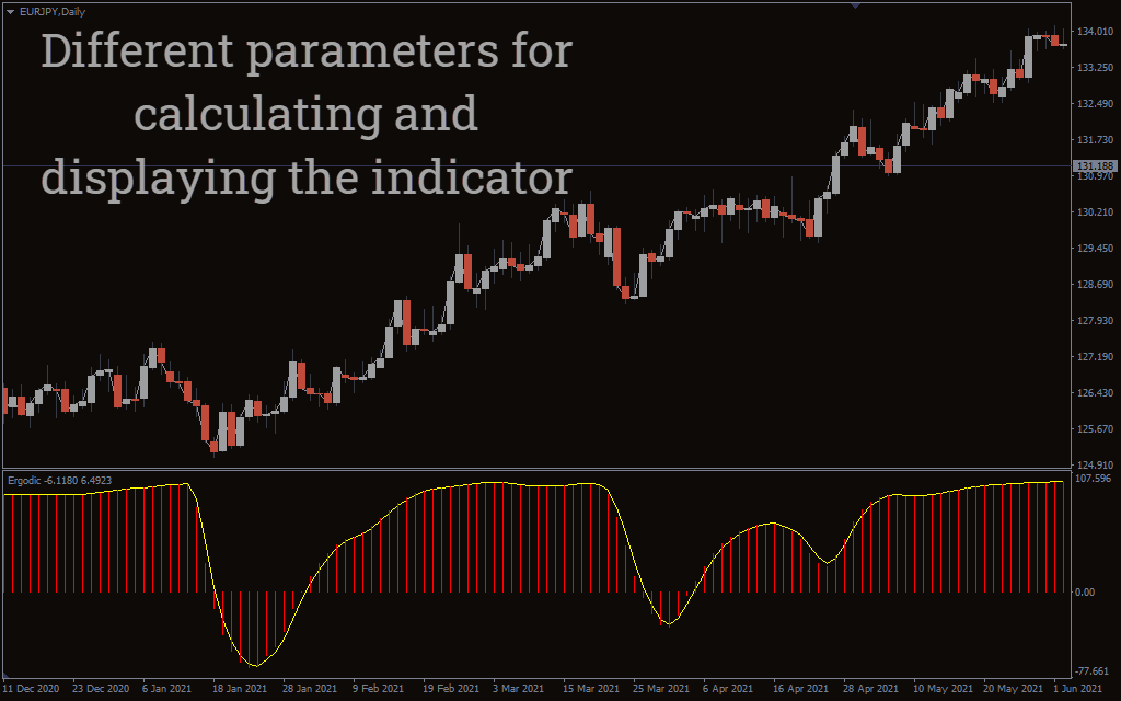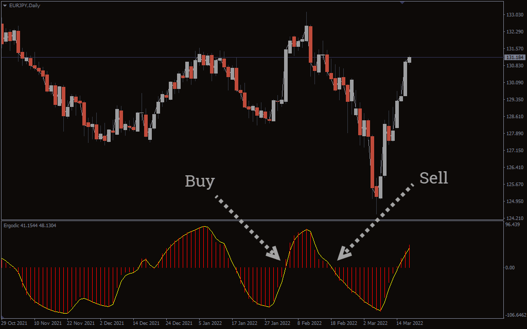 Ergodic is an easy-to-use oscillator that gives straightforward buy and sells signals. Simply buy when the indicator crosses above the zero line and sell when it dips below the line. You can use this indicator to boost your trading strategy or confirm other strategies. It will prove helpful, especially if you are getting acquainted with the market movement.