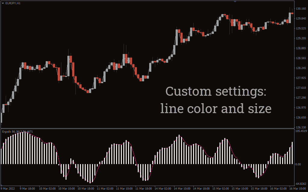 The Ergodic indicator looks similar to the MACD indicator. It features bar charts and a smooth moving average oscillating around a zero line. Additionally, the indicator forms in a separate window below the price chart.