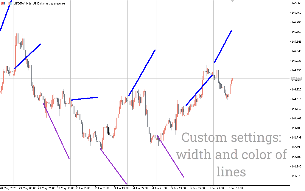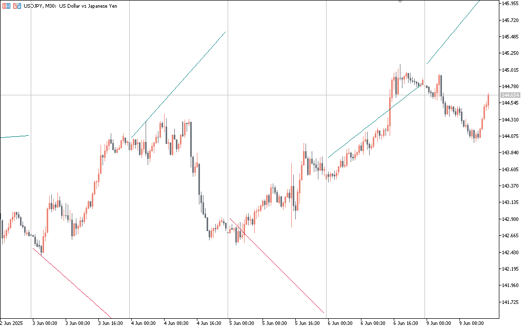This indicator plots diagonal lines that extend the most recent trend segment based on the selected timeframe. For example, when set to “1 Day”, the tool calculates the slope of the previous day’s trend and continues it forward on the current chart.
