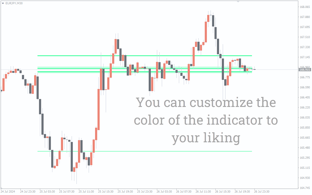 The major difference from regular Fibonacci based indicators is the dynamic support and resistance. As the ATR changes with the volatility, this indicator positions the support and resistances accordingly. Obviously, the cluster with more number of lines becomes the strongest support or resistance.