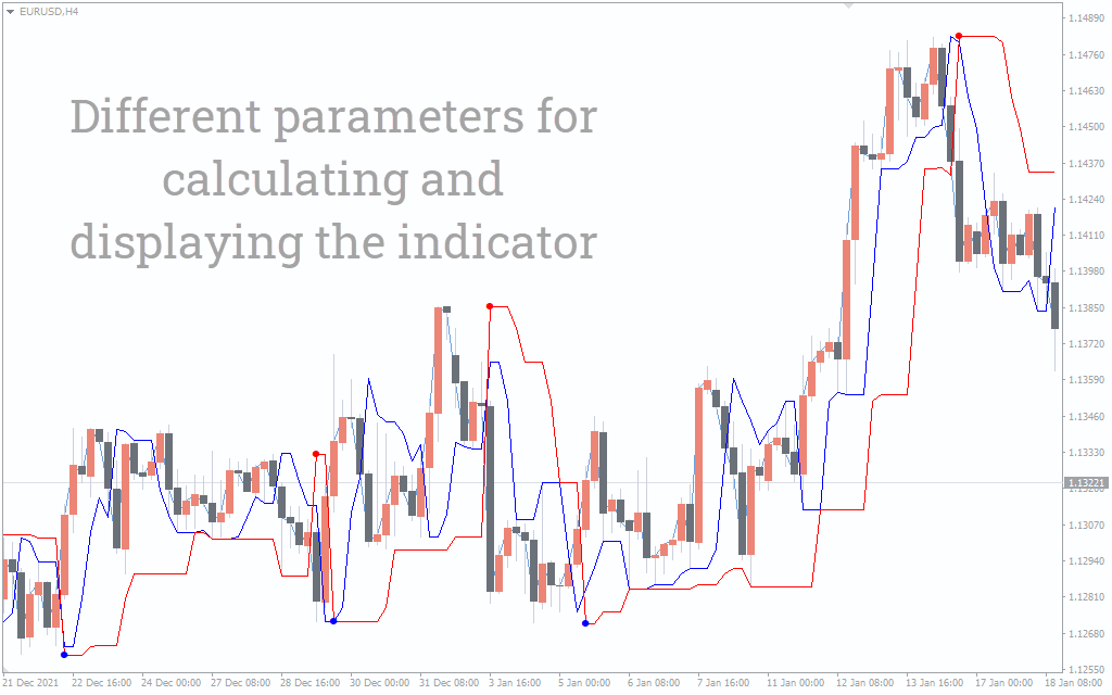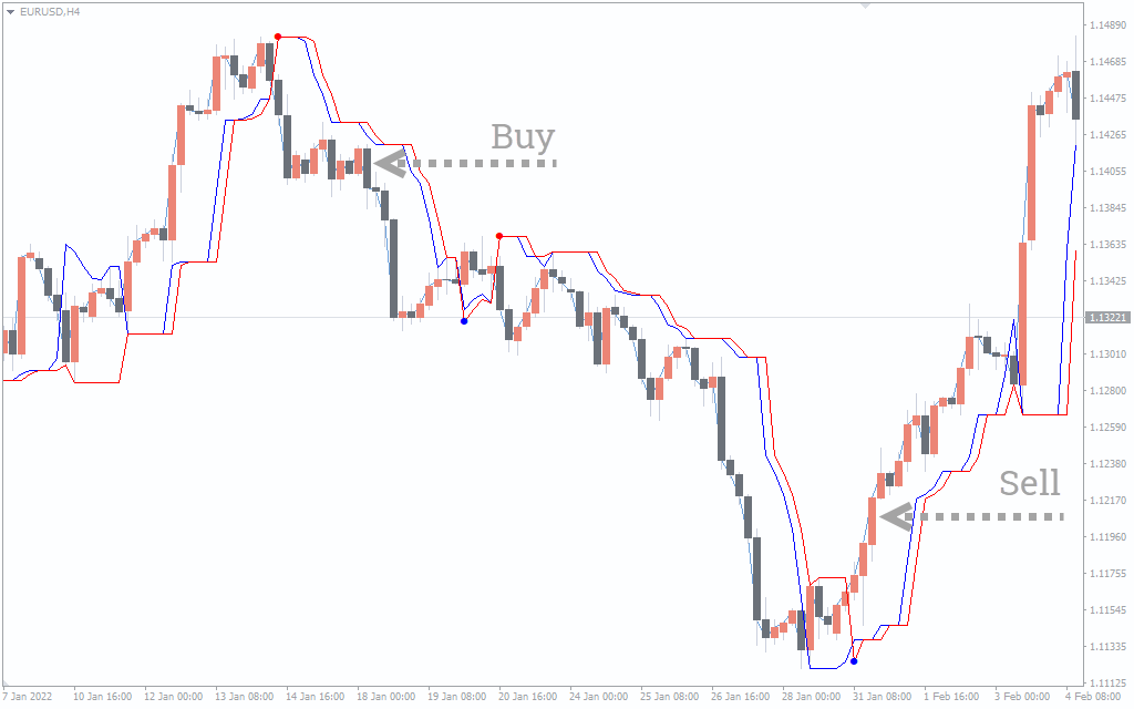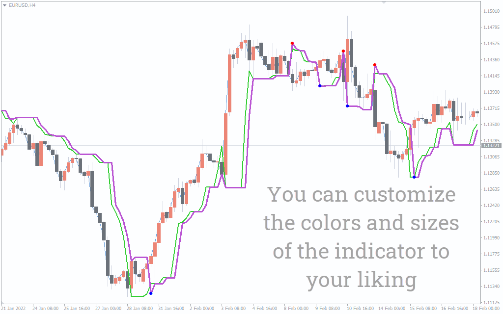 A bullish trend is depicted when the price is above the blue line, while a bearish trend is depicted when the price is below the red line. Besides the red and blue lines, the indicator also comes with a red and a blue dot which acts as a confirmation for a bullish/bearish move.