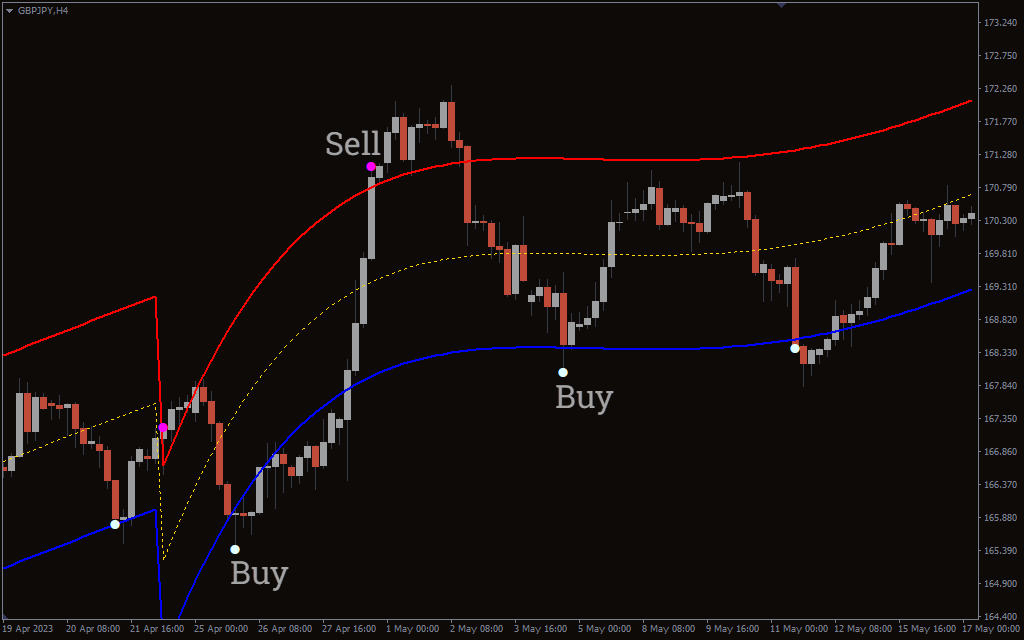 The above GBP/JPY H4 chart shows the BUY/SELL signals of the indicator. You can look for a bullish signal for a BUY strategy when the price approaches or touches the lower blue band.