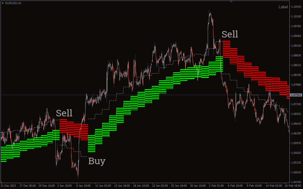 The trading signals are pretty simple and are based on the crossover of the price and the cloud. If the price closes higher than the cloud and if the cloud color is green, then traders should enter the markets with a buy trade. A stop loss below the cloud is sufficient to secure the trade, however traders should exit the position in profits at an opposite trading signal.