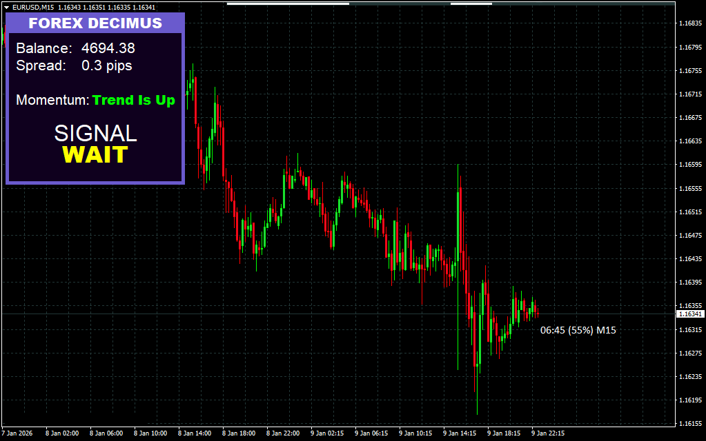 The Forex Decimus Indicator is a multifunctional trading tool designed to analyze market momentum, trend direction, and candle timing in real time. It combines visual market data with timing logic, helping traders understand not only where the market is heading, but also when it is better to act or stay out. From my own experience, this is the kind of indicator that encourages patience rather than overtrading, which is something most traders struggle with. I especially like how it clearly shows when the market is not ready and displays a “WAIT” state instead of forcing signals.