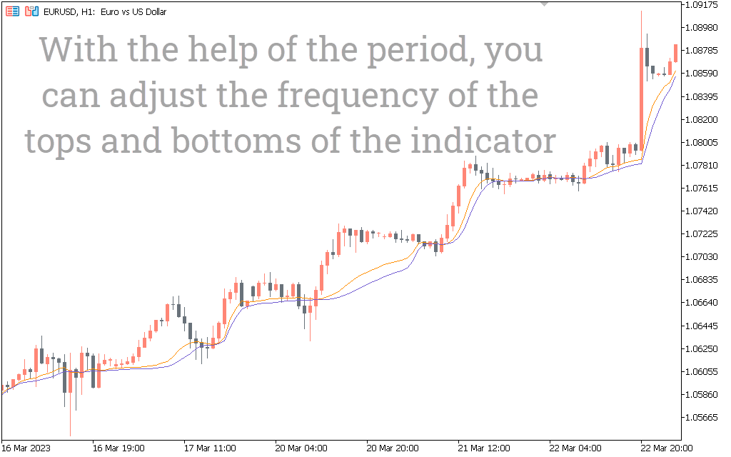 The above EURUSD H1 price chart shows the Fractal Adaptive Moving Average indicator for MT5 in action. The indicator draws an indicator line and a signal line on the price chart.