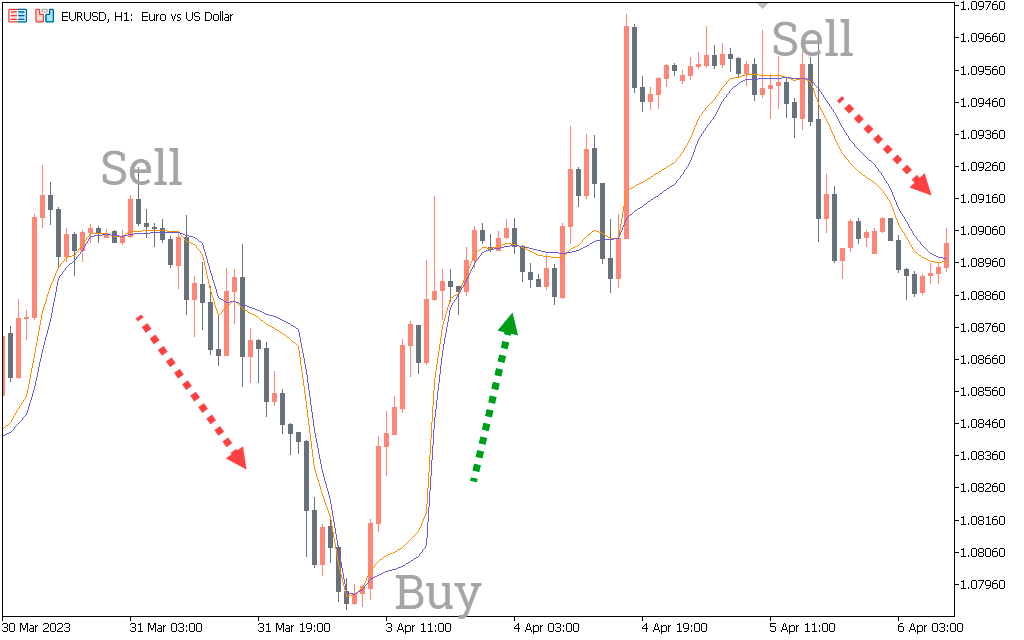 If the red line crosses the blue line, it indicates a bullish trading signal. Thus, forex traders should enter the market with a BUY position with a stop loss below the previous swing low.