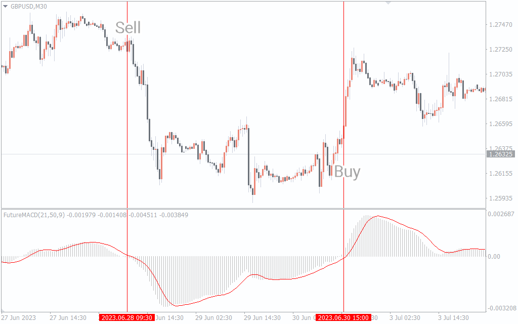 The Future MACD indicator for MT4 is similar to the original one, however it has additional lag and may provide delayed entry and exit signals. Traders should note that this indicator may not provide best results during ranging markets.