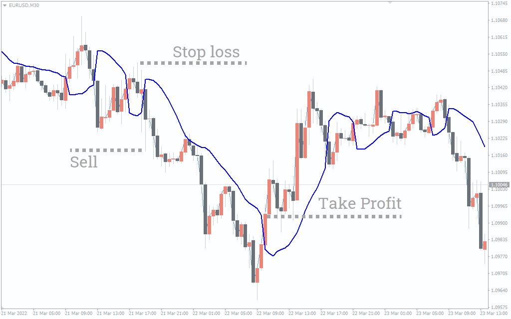The EURUSD M30 chart below shows how you can use the Gann SSL Indicator to open a short position during a bearish trend.