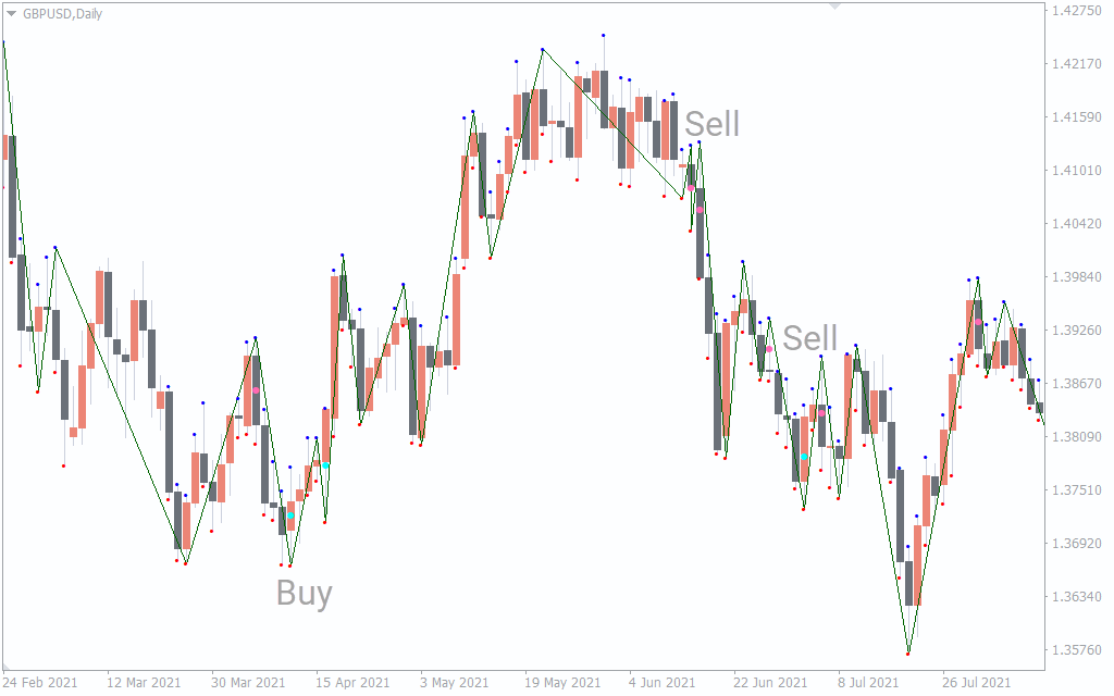 The Pink and Aqua dots plotted on the price charts provide forex trading signals. The trading strategy has two conditions with regard to trend direction and the dot color. Traders should first identify the trend direction using higher highs and higher lows or lower lows and lower highs.