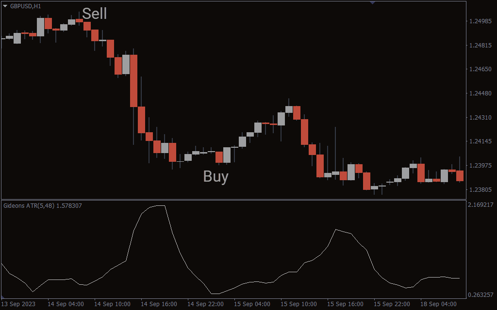 Gideons ATR Indicator For MT4 smooth ATR values using a slow and fast one to provide potential market volatility signaling buy or sell forex trade