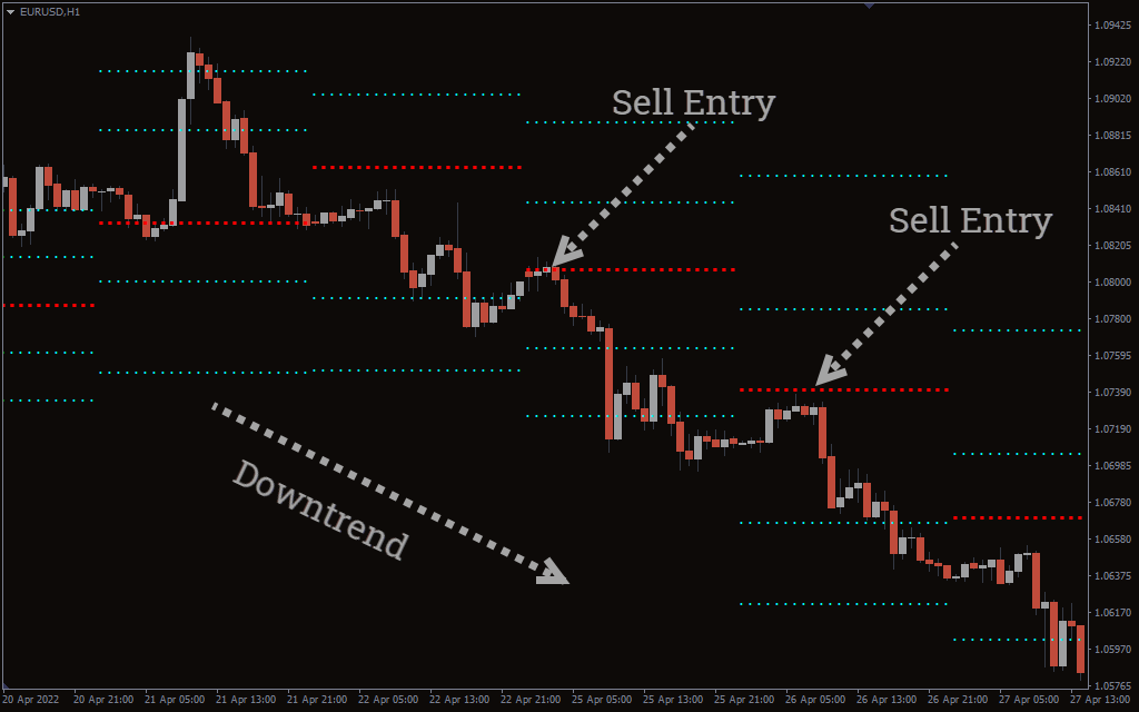 SELL Setup: First, identify the trend of the market; in this case, a bearish trend. Now, wait for the price to retrace and react to the resistance level (red lines) of the indicator. You may then open a SELL/SHORT position using price action (e.g. bearish engulfing, inverted hammer, etc.).