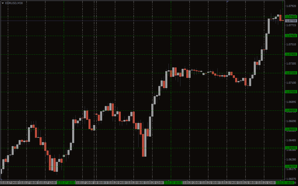 The above image shows the Grid indicator in action on the EURUSD currency pair. The green horizontal lines are the psychological zones, while the gray vertical lines depict the trading periods of past price actions. The spacing period between the horizontal lines is 20 pips; however, you may customize the spacing to suit your trading style.