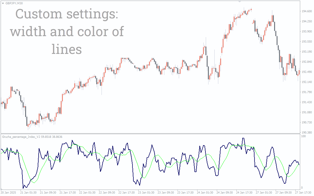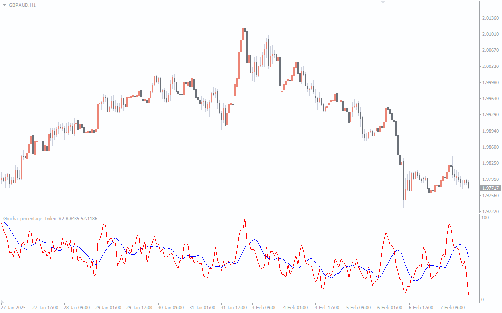 The Grucha Percentage Index Indicator detects market momentum shifts by plotting two lines—one representing the percentage index and the other a moving average for smoother signals. When the percentage line crosses above the moving average, it suggests a bullish trend, indicating a potential buying opportunity. Conversely, when the percentage line crosses below the moving average, it signals bearish momentum, suggesting a possible sell trade. Additionally, if the percentage index moves into extreme high or low zones, it can indicate overbought or oversold market conditions, signaling a potential price reversal.