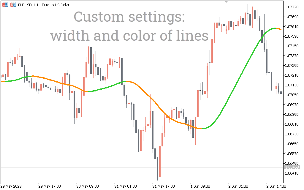 The indicator displays blue and red indicator lines on the price chart. The indicator line turns blue in a bullish market and red in a bearish market. The trading strategy is based on changing the color of the indicator line.