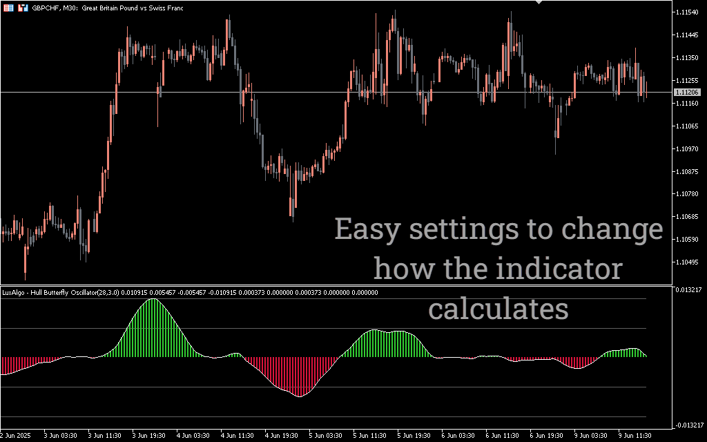 The Hull Butterfly Oscillator for MetaTrader 5 is an advanced momentum indicator created by LuxAlgo, combining the smooth responsiveness of the Hull Moving Average with dynamic signal visualization. This oscillator helps traders identify shifts in momentum with reduced lag and clearer trend separation, making it a powerful tool for trend following, swing trading, and early reversal detection.