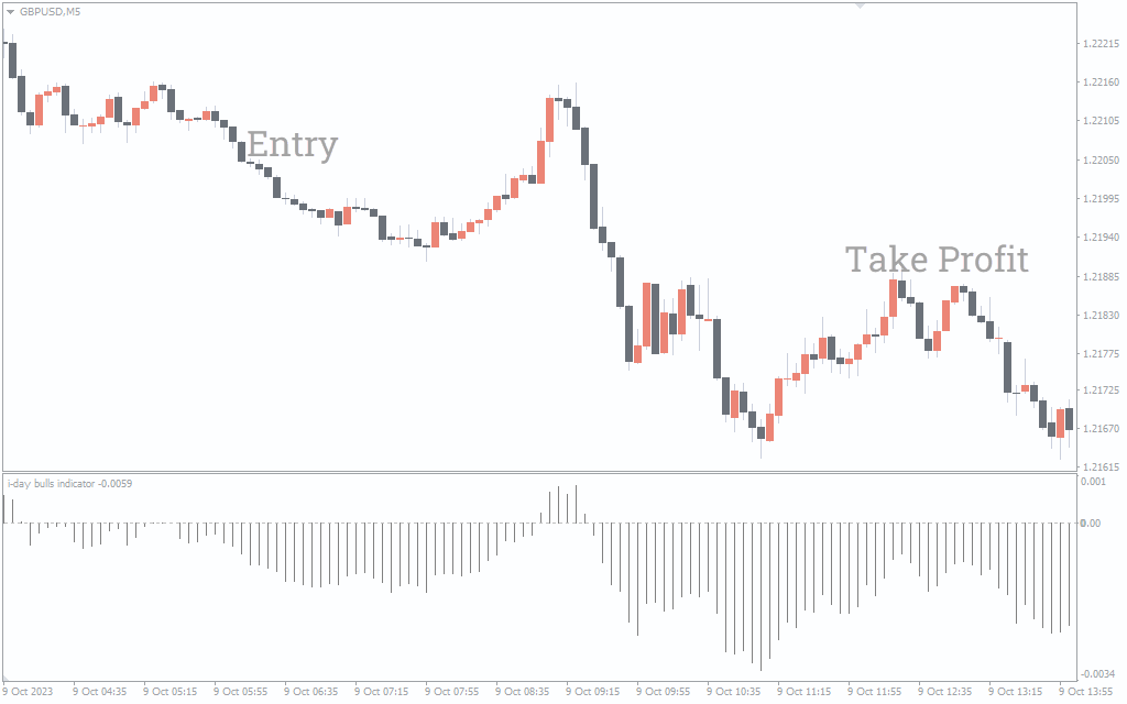 The i-Day Bulls indicator shows the strength of the bulls on a given day. It appears as a histogram on the chart. The indicator gives you clear trade entry signals, as illustrated above.