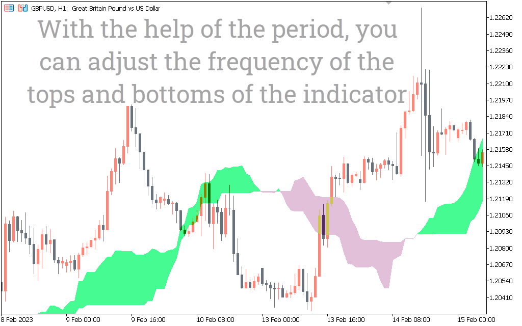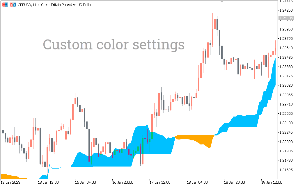 The indicator uses Tenkan-sen (fast) and Kijun-sen (slow) moving averages to generate trend crossover signals.