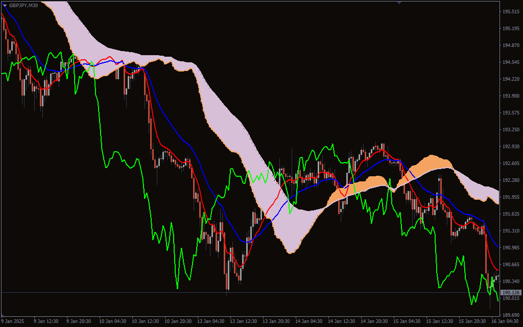 The Ichimoku MA Indicator identifies trends and turning points by utilizing its unique structure of Tenkan, Kijun, and Senkou lines. When the price crosses above the Kijun line, it signals a potential uptrend, while crossing below may indicate a downtrend. The Senkou span creates a shaded area, highlighting dynamic support and resistance levels. The Tenkan line reflects short-term momentum, helping traders spot early entry points. The indicator also provides insights into the overall market sentiment by evaluating the positioning of these lines relative to price, allowing traders to act confidently in volatile markets.