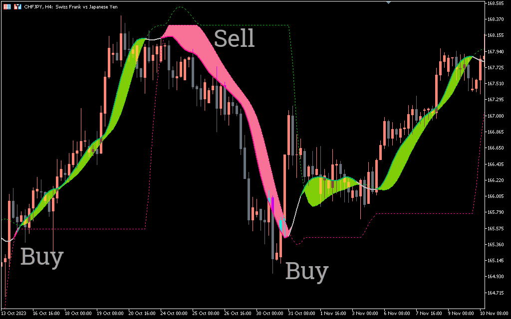 The indicator gives trade entry signals that you can use. As a bullish entry signal, the indicator turns green. Enter the trade and place a stop loss at the previous low. Place your take profit based on your risk/reward ratio.