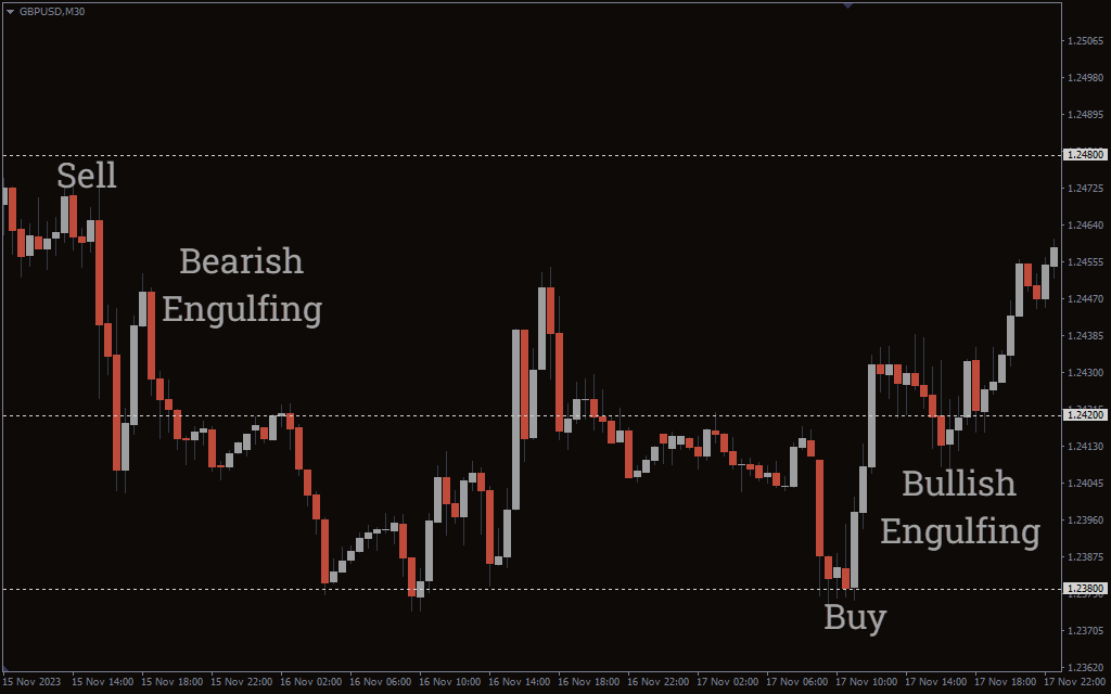 When trading with this indicator, traders should monitor when the price is precisely at these levels. When the price nears these levels and then stalls, it indicates that a reversal is approaching. When prices stall at these levels, traders should look for reversal patterns like doji, engulfing, spinning tops, pin bars, and so on to confirm a buy or sell signal.