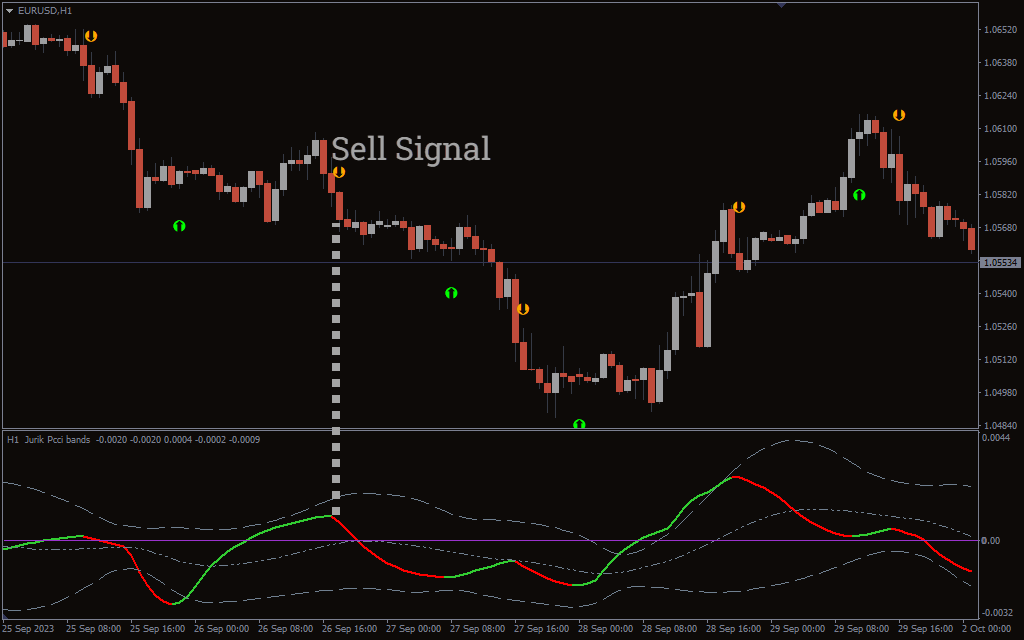 The attached image depicts the action of the Jurik PCCI Bands indicator on the EUR/USD currency pair. It shows that price action is bearish (refer to the bearish engulfing candlestick), the moving average indicates a potential bearish move, and the arrow also depicts a sell signal.