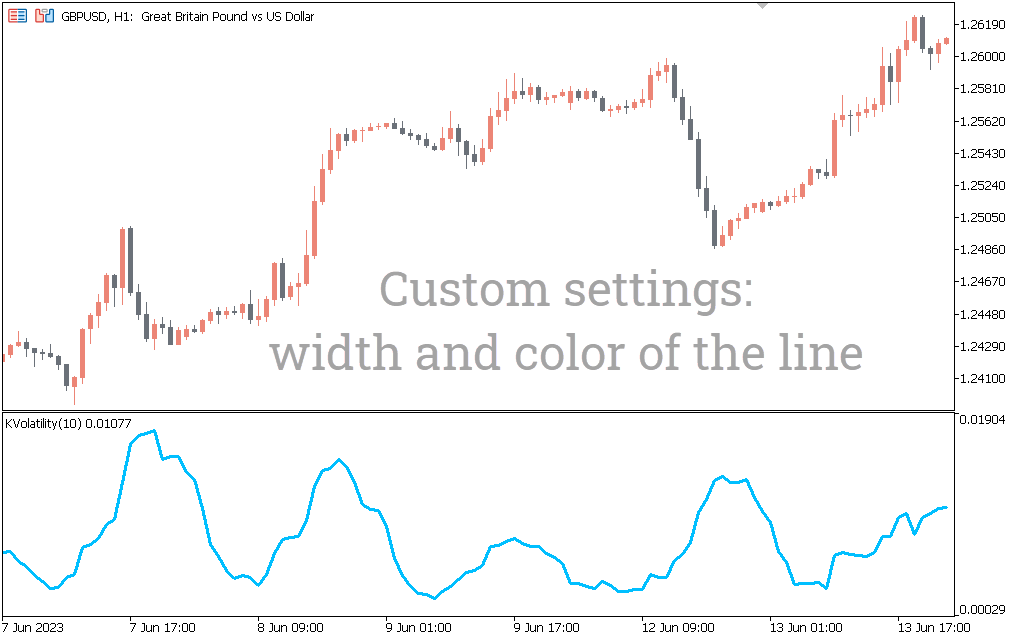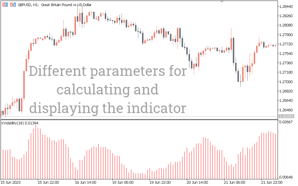 The image below shows the market volatility of the EURUSD pair using the Kaufman Volatility indicator for MT5.