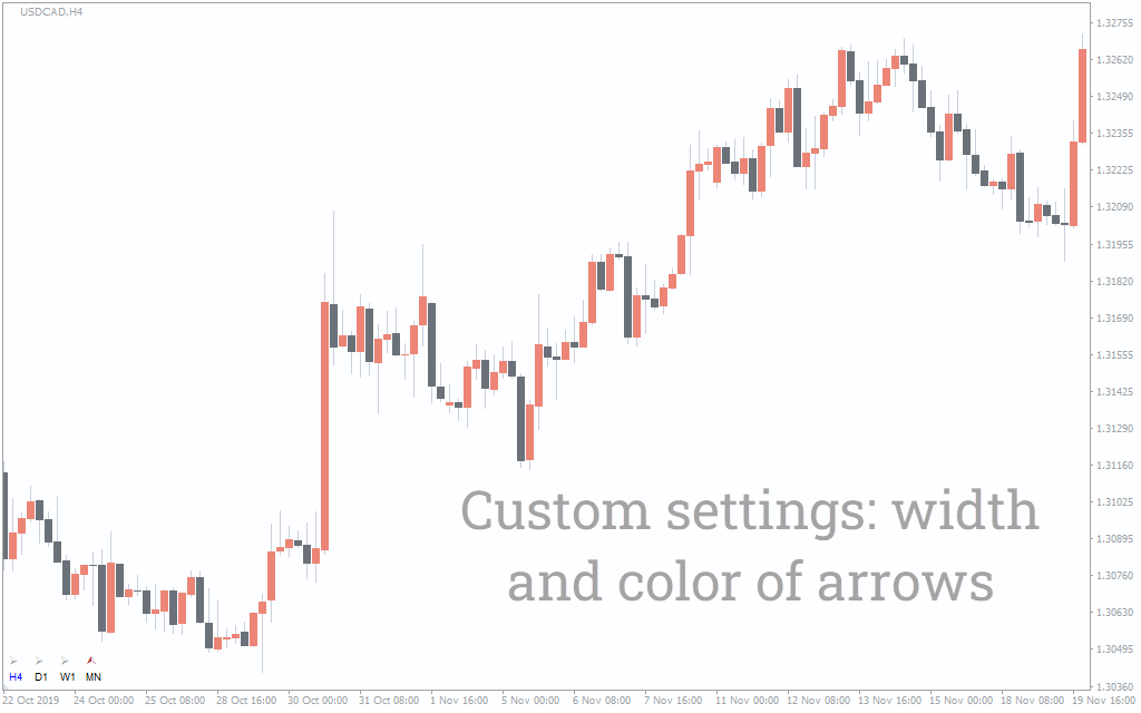 If the overall market trend is neutral or there is less volatility, then the arrows stay in grey. The Indicator works only on H4, D1, W1, and MN timeframes.