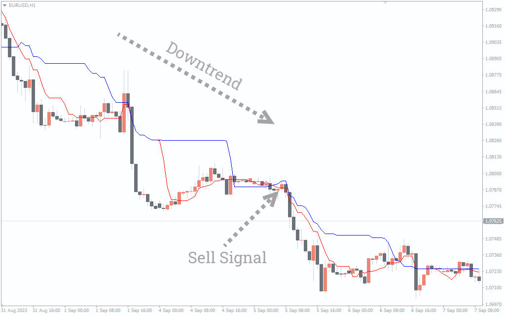 The above image depicts the buy/sell signals generated by the Kijun Tenkan indicator for MT4. The red and blue lines represent the Tenkan and Kijun lines, respectively.