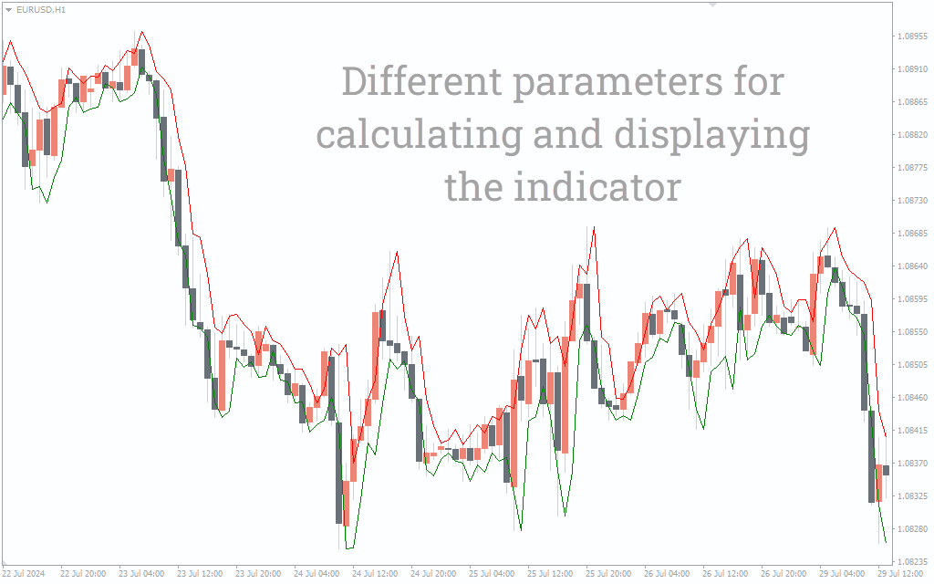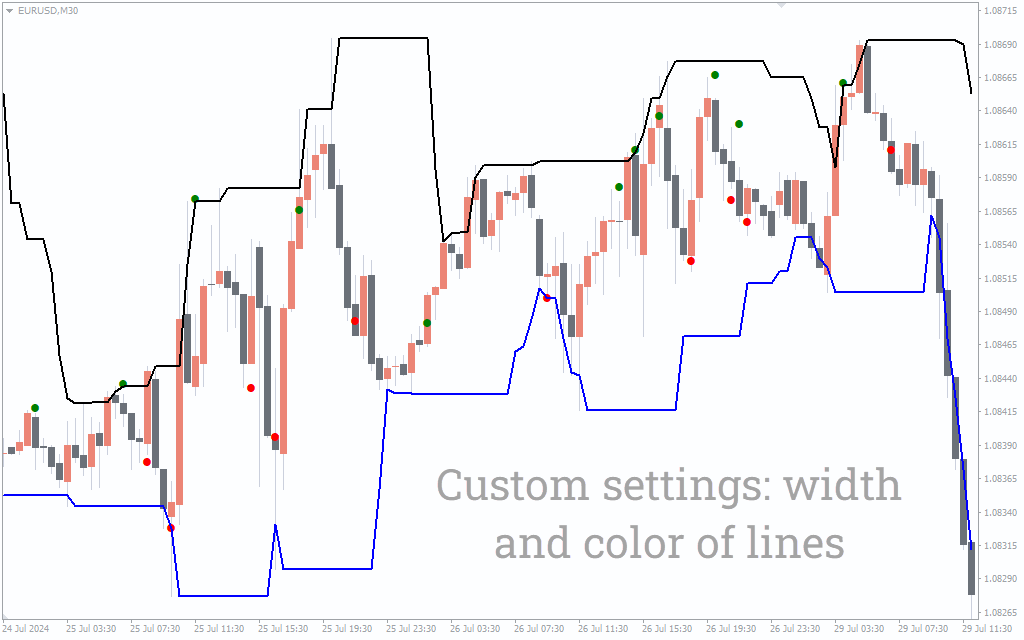 The indicator plots green dots for buy trading signals and red for sell signals. Additionally, it plots an upper red line that acts as resistance and stop loss line for sell signals. Similarly, it draws a lower green line as support and stop loss for buy trading signals.