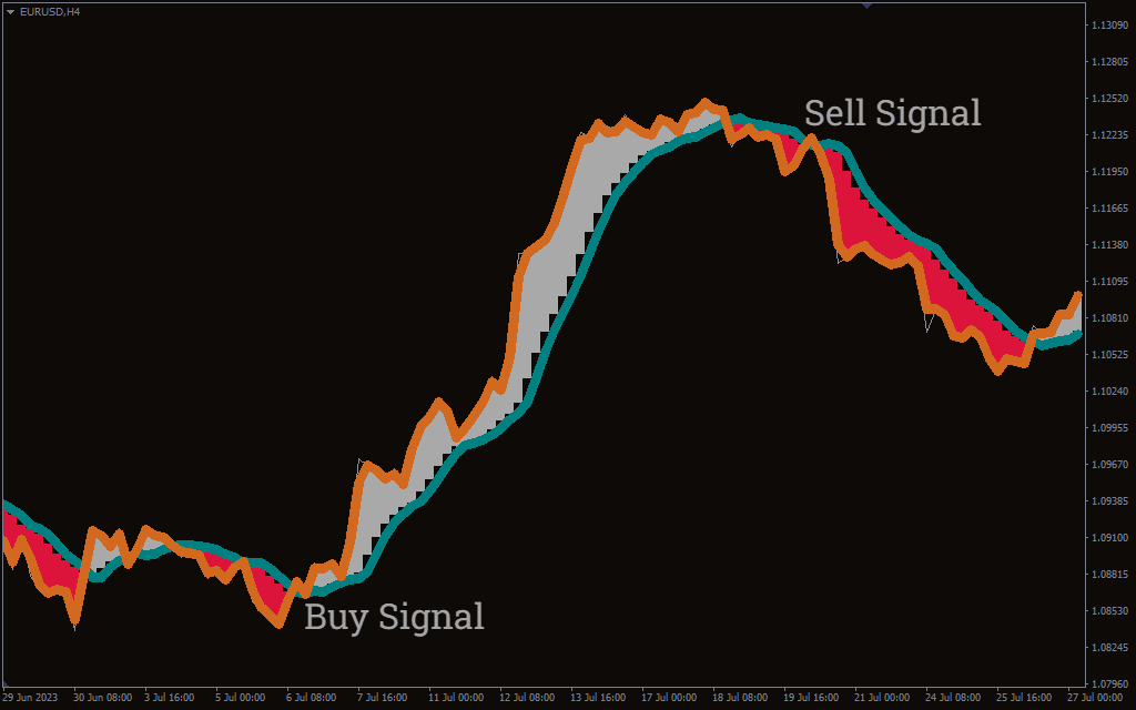 The above shows how the indicator would look on your chart. The teel and chocolate lines are the moving average indicators, while the crimson and gray-colored zones are the signals for buy/sell entries.