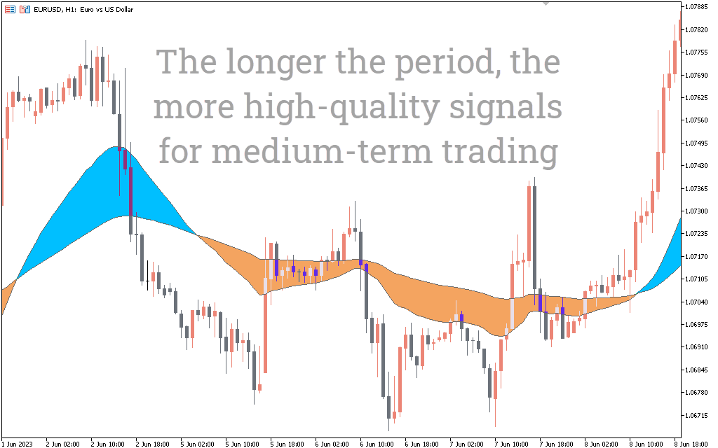 The indicator signals a potential trend change when two moving averages cross in a downward/upward direction. Additionally, it signals a buying or selling opportunity when the moving averages fill in orange/blue.