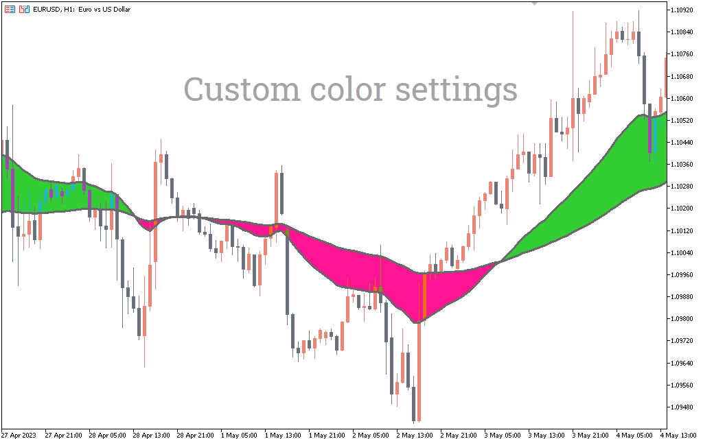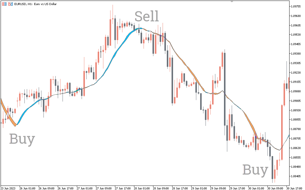 Similarly, a sell position can be opened after crossing the MA and is filled with orange forming a ribbon.