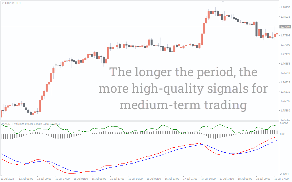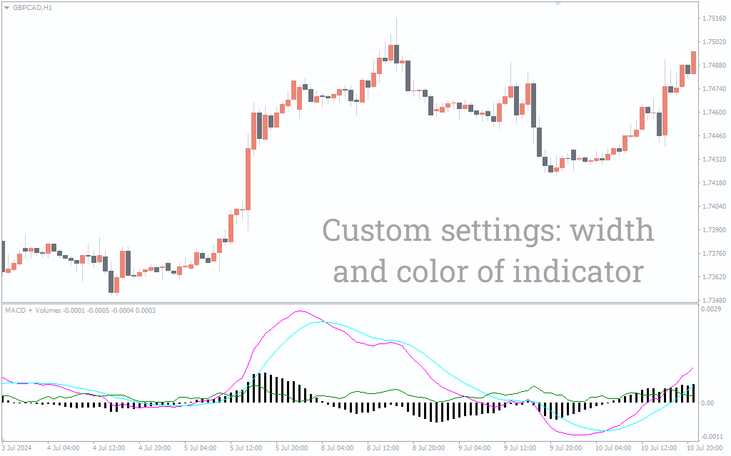 The indicator plots grey histogram bars, red and blue MACD indicator lines and a green volume line. The trading strategy is similar to the classic MACD trading strategy. However, traders can use the green volume indicator line for additional confirmation. Higher volumes indicate increased interest of traders in the forex currency pair and results in trend. On the other hand, lower volumes may indicate lack of interest and may result in price consolidation.