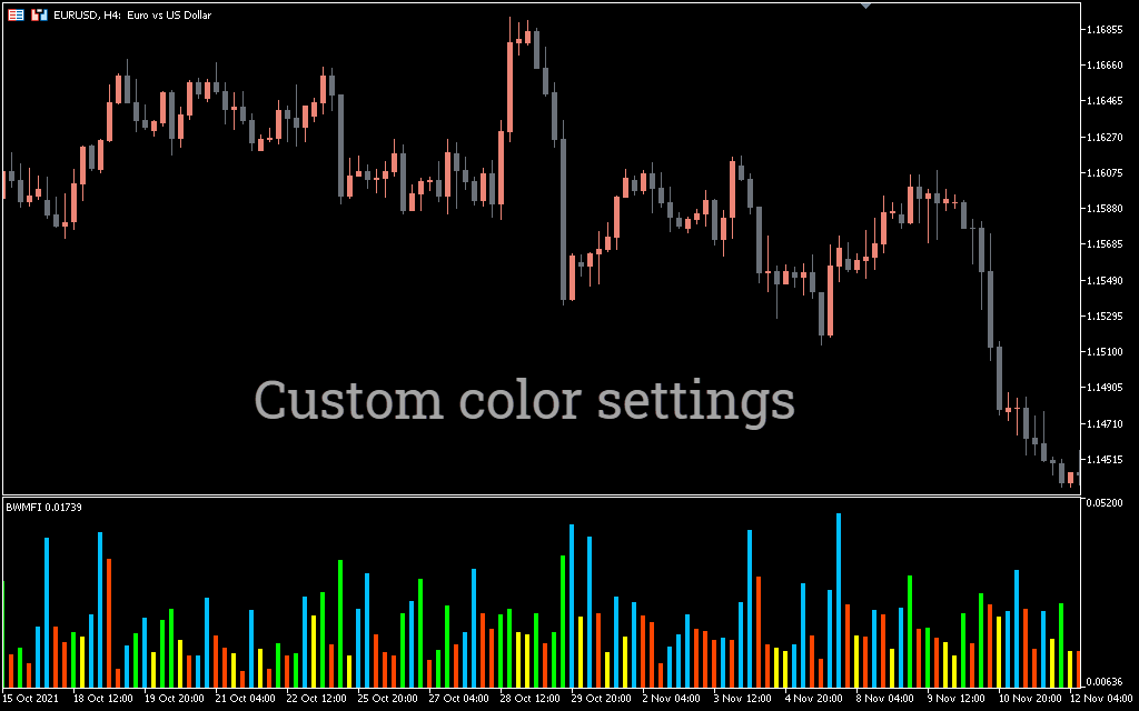 The MFI indicator was developed by Bill William and is used to determine the reversal and strength of a trend in the market. The indicator has a histogram of different colors, and each color corresponds to a specific scenario. However, the pink bar is the most important bar as it shows a potential trend reversal.