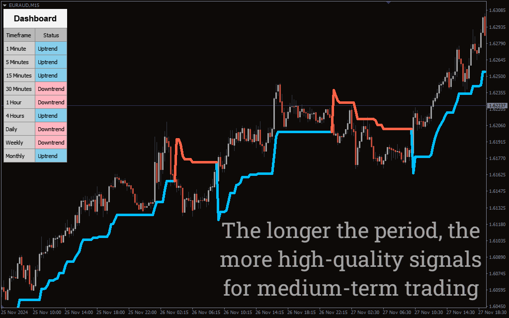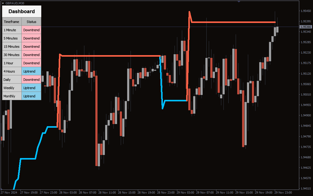 The Market Trend Scanner delivers clear and actionable trading signals by analyzing trends on multiple timeframes simultaneously. It displays these signals in a visually appealing dashboard that highlights the direction of trends for each timeframe. An uptrend is shown in blue, while a downtrend is indicated in red. Traders can easily interpret these signals to identify aligned trends across timeframes, suggesting strong market momentum.